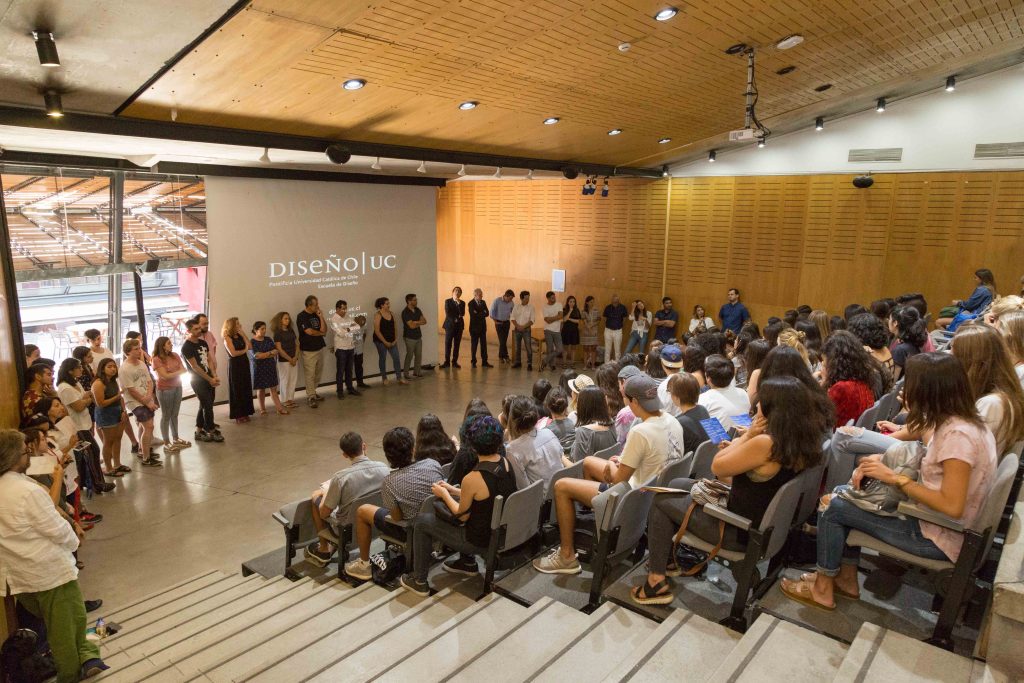 Nuevos estudiantes de la Escuela de Diseño UC fueron recibidos por los docentes y el Centro de Alumnos de la carrera, en una ceremonia de inauguración del año académico 2018 desarrollada en el Auditorio FADEU, que encabezaron el Decano de la Facultad de Arquitectura, Diseño y Estudios Urbanos, Mario Ubilla, y el Subdirector de la Escuela de Diseño, Douglas Leonard.