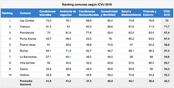 Las Condes, Vitacura, Providencia, Punta Arenas, Puerto Varas, Ñuñoa, Lo Barnechea, Viña del Mar, Castro y Valdivia son las comunas de Chile con mejor calidad de vida ya que según el Índice de Calidad de Vida Urbana (ICVU), elaborado por la Universidad Católica y la Cámara Chilena de la Construcción, se ubicaron por sobre el rango nacional (46,8%).