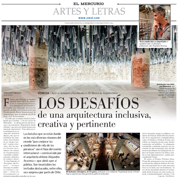 Los principales diarios chilenos destacan la participación de académicos y alumnos en la Bienal de Vencecia 2016, evento que este año dirige el arquitecto Alejandro Aravena.