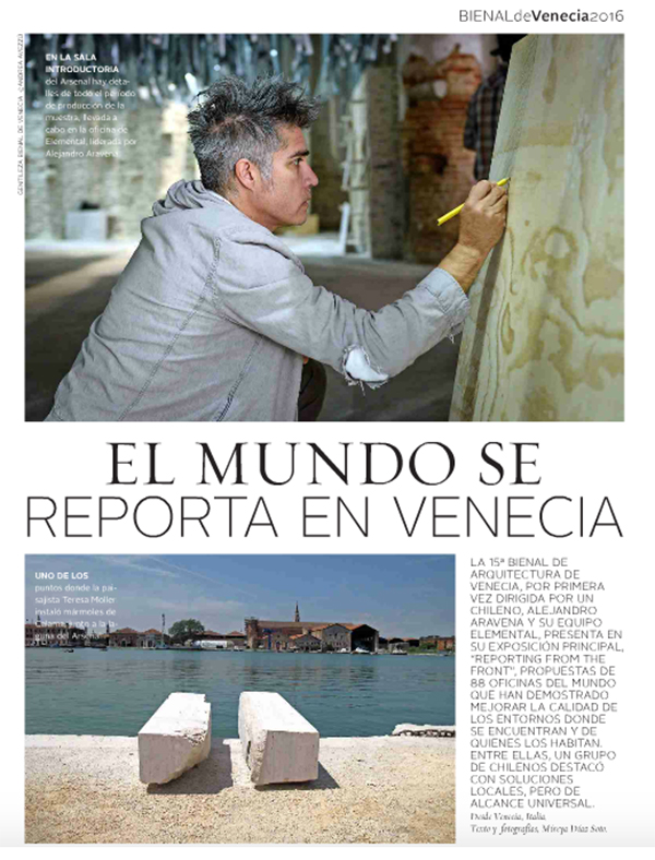 + Revista VD: “La 15ª Bienal de Arquitectura de Venecia, por primera vez dirigida por un chileno, Alejandro Aravena y su equipo Elemental, presenta en su exposición principal, “Reporting From The Front”, propuestas de 88 oficinas del mundo que han demostrado mejorar la calidad de los entornos donde se encuentran y de quienes los habitan. Entre ellas, un grupo de chilenos destacó soluciones locales, pero de alcance universal.”