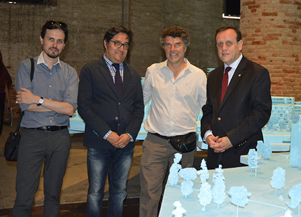 A partir de la izquierda: Direcctor de Investigación y Postgrado FADEU Felipe Encinas, el Decano FADEU Mario Ubilla, el profesor de la Escuela de Arquitectectura Rodrigo Tapia y el Resctor UC Ignacio Sánchez.