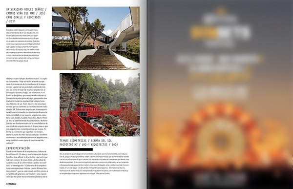 Aquí, Macarena Cortés (“Turismo y Arquitetura Moderna en Chile”), Pedro Alonso (Pabellón de Chile en Venecia 2014), Umberto Bonomo y Hugo Mondragón, todos arquitectos, docentes, doctores de la Escuela de Arquitectura de la UC, analizan los cuatro ejes sobre los cuales postulan se articula la arquitectura contemporánea chilena y revisan sus obras más relevantes.