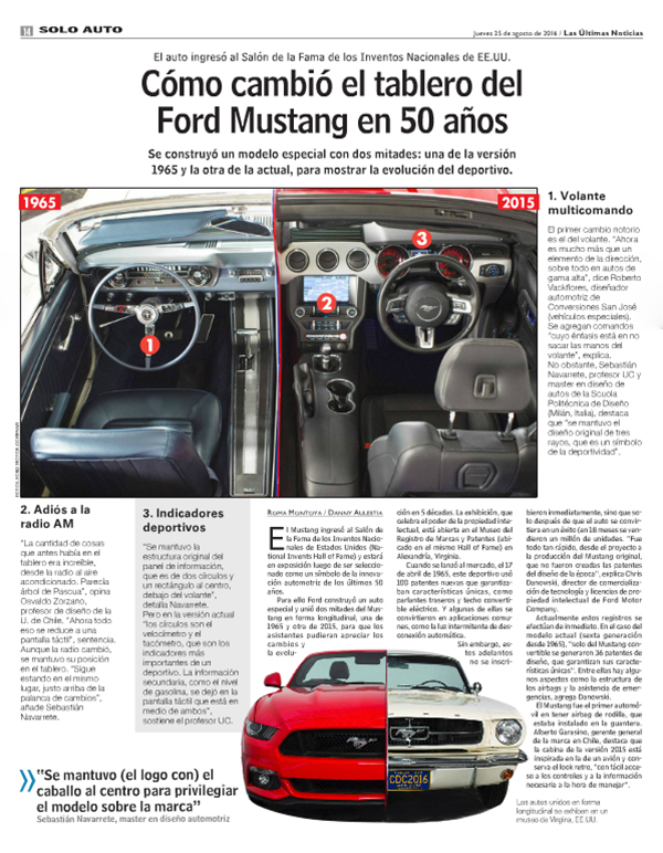 Por Las Últimas Noticias (LUN) El docente de Diseño UC Sebastián Negrete master en diseño de autos de la Scuela Politécnica de Diseño (Milán, Italia), destaca los cambio hechos en el diseño de del Ford Mustang en 50 años.