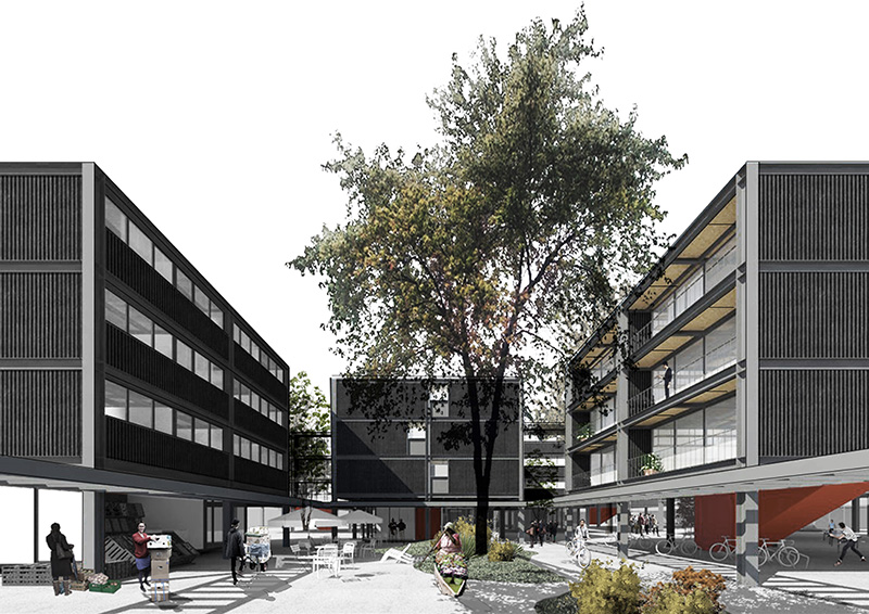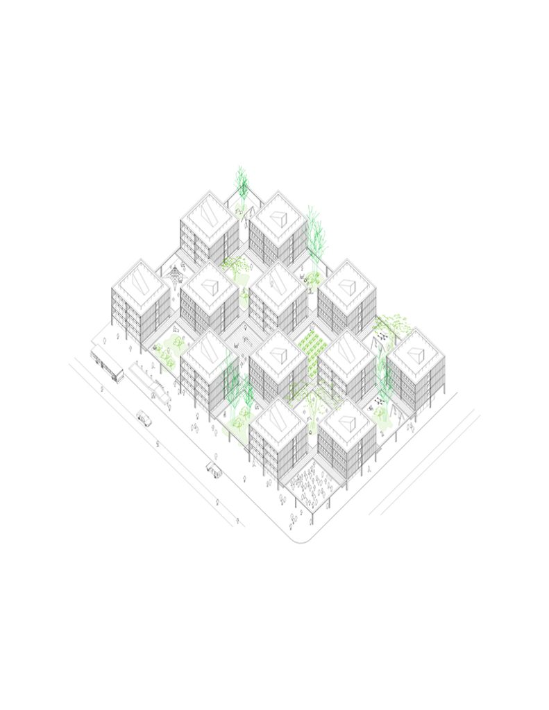 En palabras del equipo ganador: ”El proyecto, como conjunto, se estructura en función de llenos (edificios) y vacíos (plazas) en igual relación, lo que asegura que la mitad del espacio será siempre vacío. Hemos liberado el primer piso, para mezclar espacios cubiertos, que serán el soporte de accesos, comercio y servicios, con espacios abiertos, que serán un archipiélago de situaciones y usos adaptables a cada comunidad.