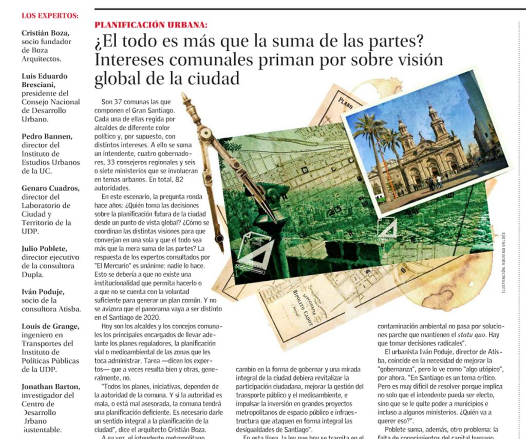 Las próximas elecciones municipales abren un debate que va más allá de los resultados electorales y las aspiraciones de las coaliciones políticas: cómo se ordenará la Región Metropolitana en los próximos cuatro años. “El Mercurio” contactó a expertos en urbanismo para que entregaran su diagnóstico sobre los aspectos fundamentales que se deben abordar. Hablan los profesores de la Escuela de Arquitectura UC Luis Eduardo Bresciani e Iván Poduje; el director de Instituto de Estudios Urbanos UC Pedro Bannen y el investigador del Centro de Desarrollo Urbano Sustentable (CEDEUS) Jonathan Barton.