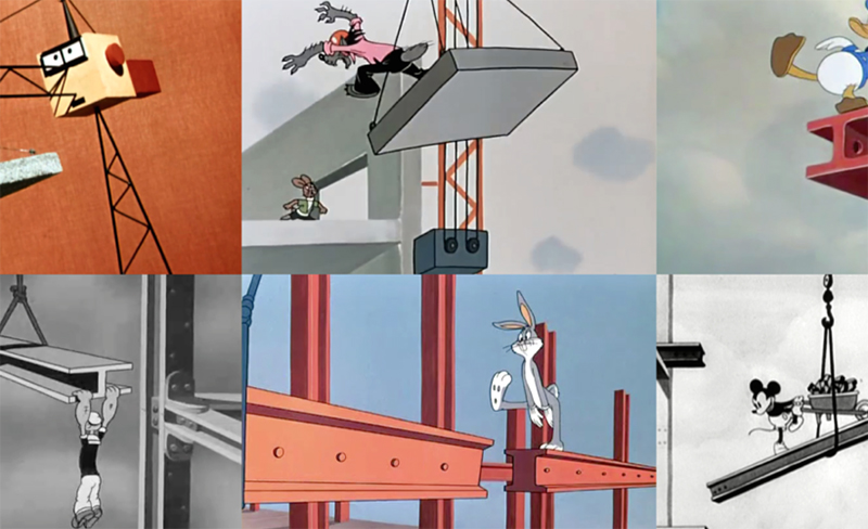 Popeye y Brutus colgados en los lados opuestos de una viga de acero a metros del suelo; Bugs Bunny camina sonámbulo sobre otra viga sin caer nunca, y Mickey Mouse corre a toda velocidad con una carretilla llena de ladrillos, cruzando de viga y viga, sin perder la sonrisa del rostro. En los años 30, Estados Unidos estaba orgulloso del sistema constructivo de sus primeros rascacielos, y así lo reflejaba en sus películas y dibujos animados. Mientras, la Unión Soviética exhibía sus efectivos paneles de hormigón en caricaturas similares, donde los personajes bailan y se trasladan sobre las inmensas estructuras.