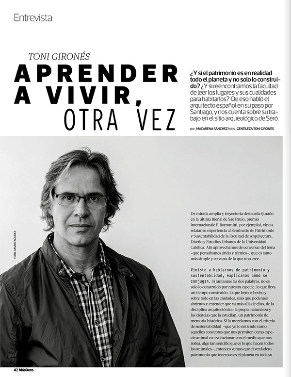Revista MásDeco de La Tercera entrevista al arquitecto español Toni Gironés, invitado a Chile para participar en seminario de patrimonio y sustentabilidad organizado por el Magíster de Arquitectura Sustentable y Energía (MASE UC).