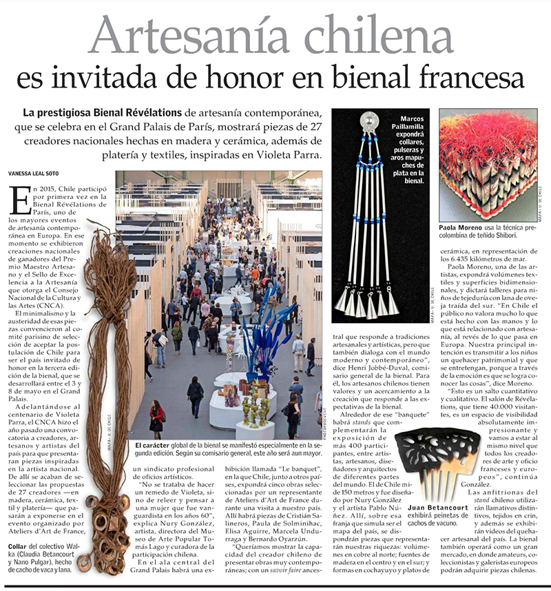 Por Vanessa Leal Soto, El Mercurio Paola Moreno, docente Diseño UC, fue destacada en la sección cultura del diario El Mercurio por ser una de los 27 seleccionados por el Consejo Nacional de la Cultura y las Artes para exhibir en la Bienal Révélations de Paris entre el 3 y 8 de mayo en el Grand Palais.