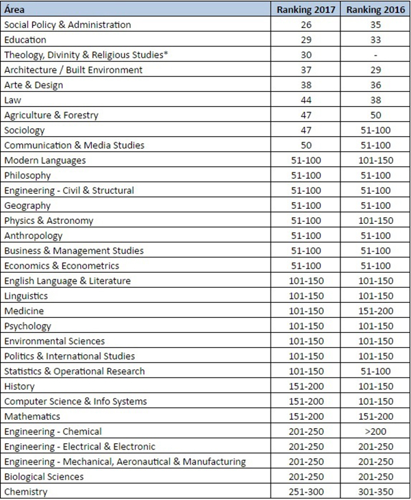 El QS por áreas presenta cuatro temas nuevos este año, lo que significa que el ranking ahora abarca un total de 46 disciplinas. Los cuatro nuevos temas son Anatomía y Fisiología; Gestión de Hospitalidad y Ocio; disciplinas relacionados con el Deporte y Teología Divinidad y Estudios Religiosos.