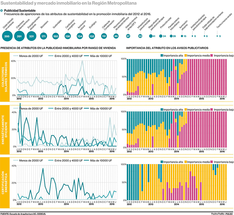Un estudio realizado por la Escuela de Arquitectura de la UC y el CEDEUS, concluyó que los elementos sustentables como el “doble vidriado en ventanas”, o los “colectores solares térmicos” han ido disminuyendo en la publicidad e interés de los consumidores. El único que ha aumentado es la “certificación energética”