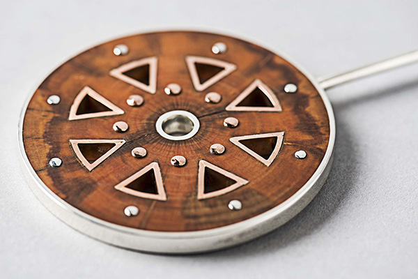 La materia de Cristián Molina es la madera picoyo, con la que realiza sus tupu –alfileres o prendedores tradicionales mapuches, que se usan para fijar el kepan (manto)–, a los que agrega calados e incrustaciones de plata. “El picoyo es el nudo que se encuentra en la unión entre el tronco y la rama de la araucaria que tras pasar por un proceso de descomposición natural se ha convertido en resina”, explica. Molina subraya por qué la materia prima que ha elegido para estas piezas es tan preciosa: “Esta madera que se parece mucho al ámbar no se vende, no hay en el mercado: se consigue y nunca dos veces de la misma persona. Quizás alguien me dice, ‘tengo un trozo de picoyo’ y me lo da, y yo le ofrezco alguna pieza de orfebrería a cambio”.