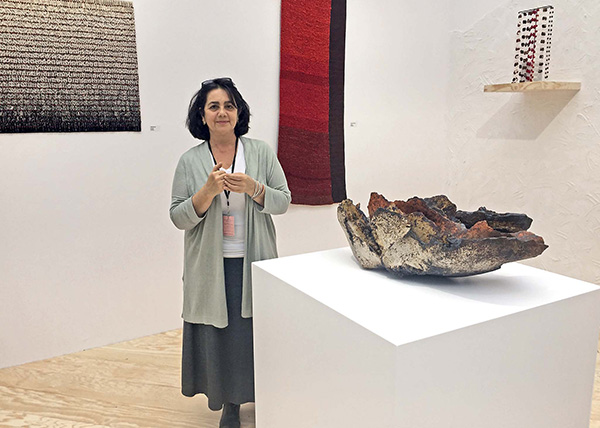 La variedad de las obras concentrada en los 150 metros cuadrados del stand y en ‘el banquete’, el espacio central de la exposición, es enorme. Las extrañas piezas tejidas en alga cochayuyo de Lise Moller; las esculturas de arcilla de Marcela Undurraga, que evocan el arte prehistórico; los tapices de Carolina Yrarrázabal, una fusión entre el arte precolombino, el Bauhaus y el minimal art; las misteriosas formas humanas en mimbre de Rodolfo Castro; las joyas de Walka, el taller de Claudia Betancourt y Nano Pulgar, que rescatan la idea de los collares sagrados en cuerno de la tribu aimara; las indefinibles esculturas construidas en gres sobre placas de arcilla, cuarzo y chamote de Pascale Lehman; el monumental hombre en madera de Bernardo Oyarzún (actualmente en la Bienal de Venecia), y la no menos monumental Mecánica Áptica, pieza en madera de Cristián Salineros, un habitué de la obra en espacio público.