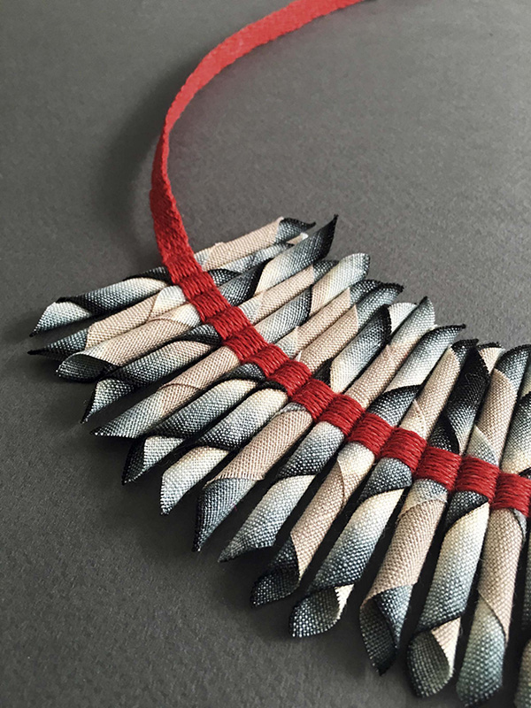Paola Moreno, por su parte, utiliza técnicas antiguas para trabajar con textiles, especialmente con restos de lino fabricado en algunas de las usinas chilenas que dejaron de funcionar hace décadas. “Trabajo con elementos modulares, con seda o restos de lino, aplicando el teñido shibori. Me interesa trabajar con materiales nobles y poner en valor una manualidad que de una manera está desapareciendo”, explica. Diplomada en diseño textil e historia del arte y profesora en la Universidad Católica, Moreno es miembro del Comité Nacional de Conservación Textil y del Centro de Arte Textil, donde también imparte clases. Si su descripción de su propio trabajo suena como un quehacer divertido –“corto tiritas, las tiño y las vuelvo ensamblar”–, el resultado es bello, complejo y sofisticado.