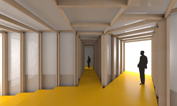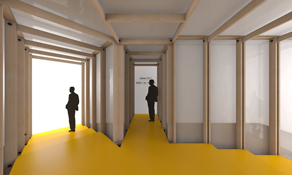 La exposición que se realiza desde hace cuatro años, al interior de la Galería de Arte del Centro de Extensión de la UC, constará de un pabellón realizado íntegramente en madera donada a la FADEU. Éste articula una serie de brazos, que llevan a distintas proyecciones a modo de ventanas o balcones sobre el perímetro de la sala. Existe 4 brazos: uno que conforma el acceso y conduce al interior a través de una rampa que eleva el nivel de suelo, dos de menor tamaño que se disponen mirando las curvaturas de la sala, y uno de mayor ancho que se proyecta perpendicularmente a uno de los muros y con escalones permitirá su uso a modo de pequeño anfiteatro. De esta forma, existe un centro de distribución que recoge las distintas direcciones de los brazos.