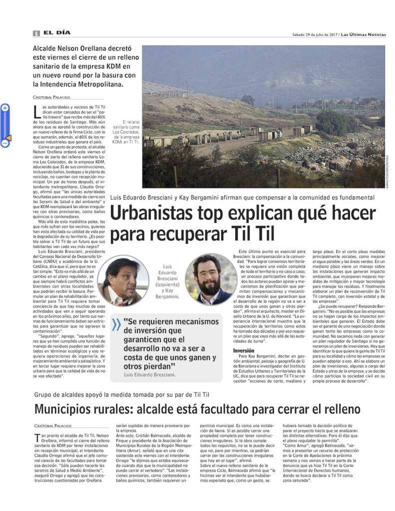 Kay Bergamini, docente e investigador del Instituto de Estudios Urbanos y Territoriales UC, conversó con diversos medios de comunicación sobre institucionalidad ambiental, a propósito de la aprobación del Relleno Sanitario Industrial en la comuna de Til Til, por parte del Consejo de Ministros.