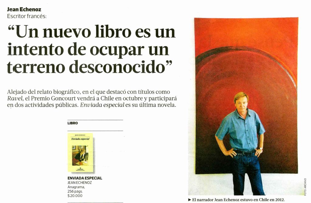 Por Javier Garcia. La Tercera. El diario La Tercera destaca nueva visita a Chile del escritor Jean Echenoz, que estuvo en el país en 2012 invitado por el programa La Ciudad y las Palabras del Doctorado de Arquitectura y Estudios Urbanos. + Lee reportaje completo aquí.