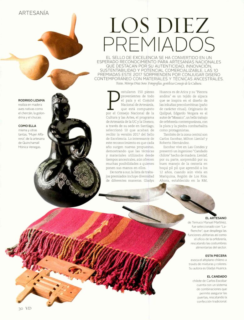 Por Mireya Díaz. VYD Vivienda y Decoración de El Mercurio destaca a los diez artesanos premiados con el Sello de Excelencia por el Comité Nacional de Artesanía. La entidad está integrada por el Consejo Nacional de la Cultura y las Artes, el Programa de Artesanía UC y la Unesco.