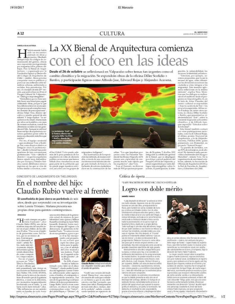 Por Daniela Silva Astorga. El Mercurio. Desde el 26 de octubre se reflexionará en Valparaíso sobre temas tan urgentes como el cambio climático y la migración. Se expondrán obras de la oficina Diller Scofidio + Renfro, y participarán figuras como Alfredo Jaar, Edwards Rojas y Alejandro Aravena.