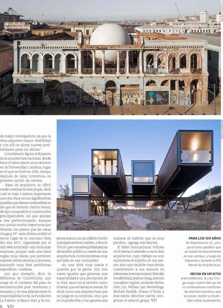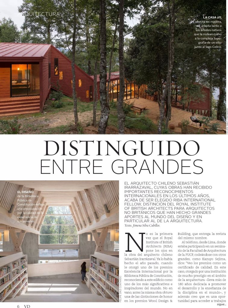 Por Jimena Silva. Revista VD de El Mercurio destaca que el arquitecto y profesor de la Escuela de Arquitectura Sebastián Irarrázaval acaba de ser elegido RIBA International Fellow, distinción del Royal Institute of British Architects, para arquitectos no británicos que han hecho grandes aportes al mundo del diseño y en particular al de la arquitectura.
