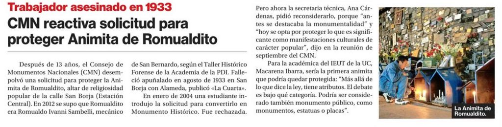 La Segunda publica que Consejo de Monumentos Nacionales reactiva solicitud para proteger animita de Romualdito. Habla la profesora Macarena Ibarra. + Revista nota completa aquí.
