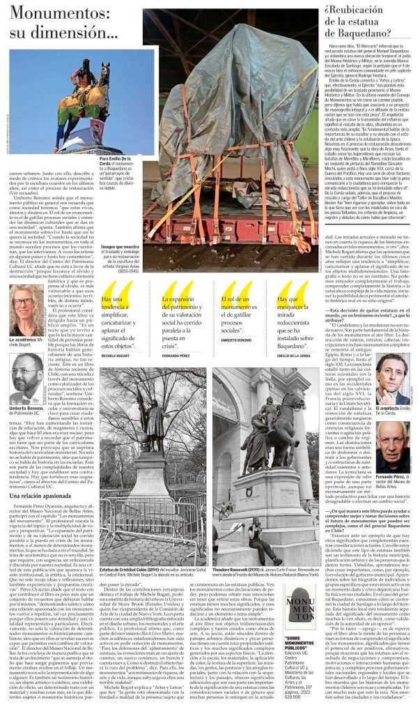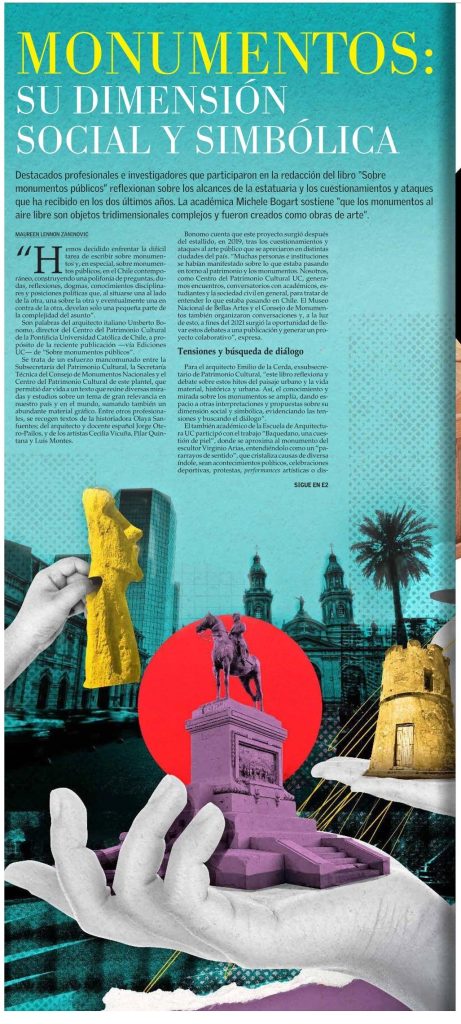 Artes y Letras de El Mercurio destaca que los autores del libro Sobre monumentos públicos —una publicación de Ediciones UC, Centro Patrimonio Cultural UC y Ministerio de las Culturas, las Artes y el Patrimonio— reflexionan sobre los alcances de la estatuaria y los cuestionamientos y ataques que ha recibido en los dos últimos años. Habla Umberto Bonomo, director del Centro del Patrimonio y Emilio de la Cerda, exsubsecretario de Patrimonio Cultural y académico de la Escuela de Arquitectura UC.