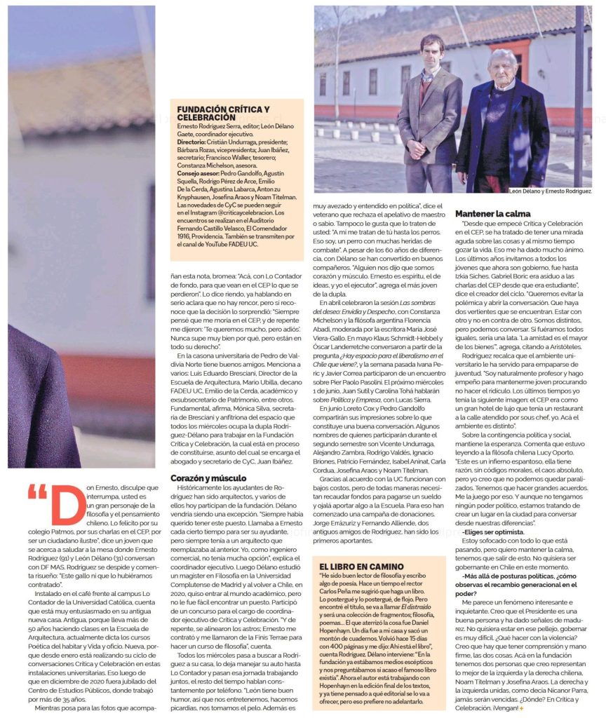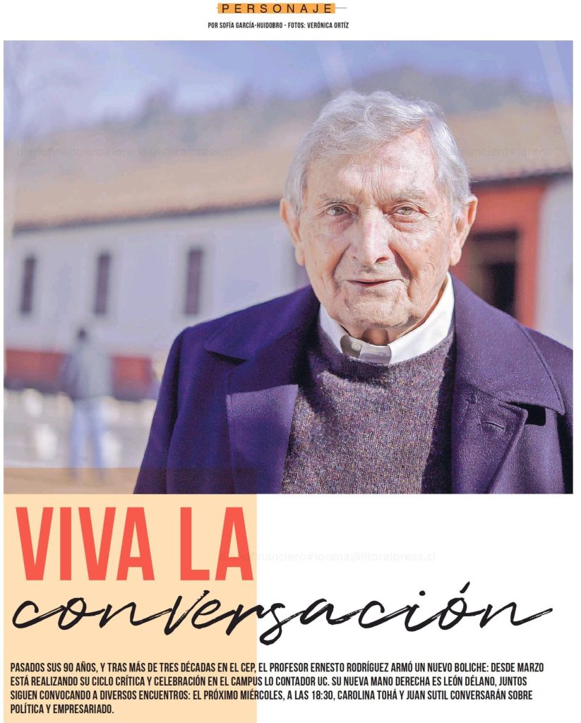 Diario Financiero destaca que el profesor Ernesto Rodríguez está realizando su ciclo de conversaciones Crítica y Celebración en el Campus Lo Contador UC. Los encuentros se realizan en el Auditorio Fernando Castillo Velasco y se transmiten por el canal de YouTube de la facultad.