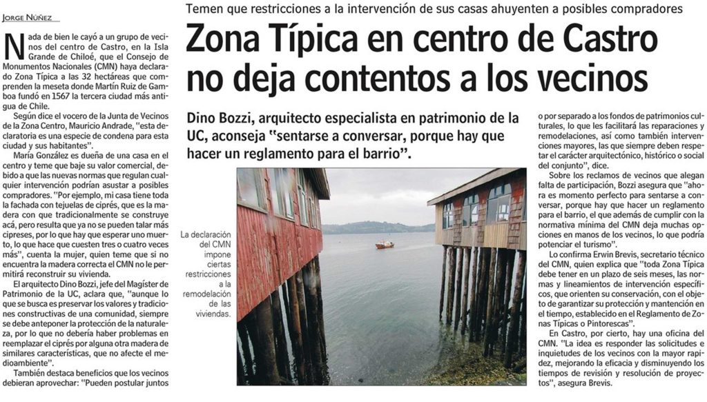 Las Últimas Noticias destaca que vecinos temen que declaración de Zona Típica de centro de Castro ahuyente a posibles compradores. Habla el académico de la escuela de Arquitectura, Dino Bozzi.