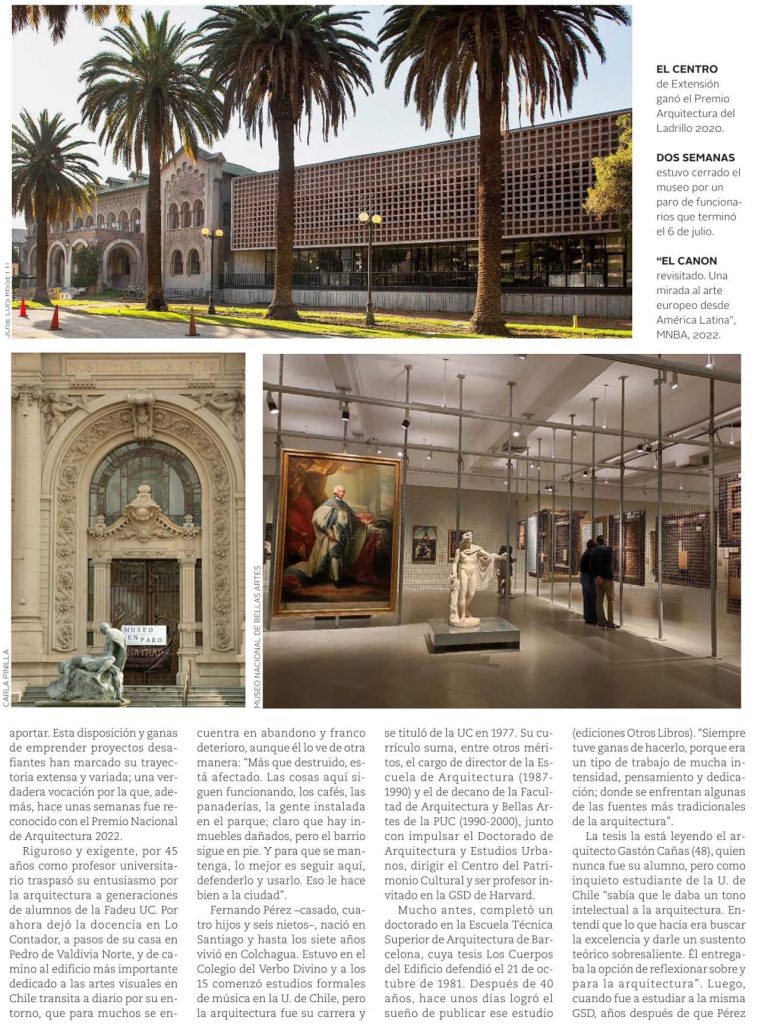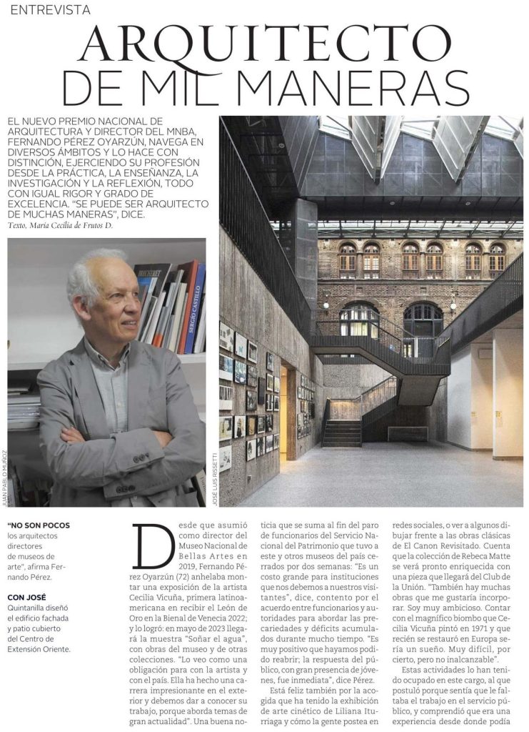Revista VD de El Mercurio destaca la trayectoria y la obra del arquitecto Fernando Pérez, nuevo Premio Nacional de Arquitectura y director del Museo Nacional de Bellas Artes. + Revisa nota completa aquí.