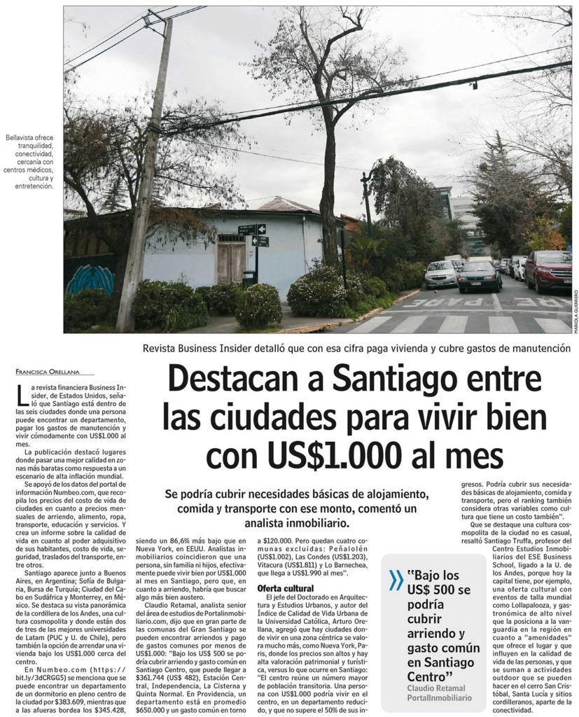 Las Últimas Noticias destaca que la revista financiera Business Insider, de Estados Unidos, señaló que Santiago está dentro de las seis ciudades donde una persona puede encontrar un departamento, pagar los gastos de manutención y vivir cómodamente con US$1.000 al mes. Habla el autor del Índice de Calidad de Vida Urbana UC, Arturo Orellana.