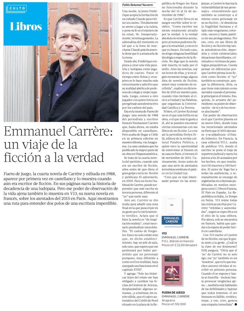 La Tercera destaca que publican por primera vez en castellano Fuera de juego, la cuarta novela de Emmanuel Carrére, editada en 1988. Se menciona su visita a Chile en 2015, cuando vino invitado al ciclo La Ciudad y las Palabras de la UC.