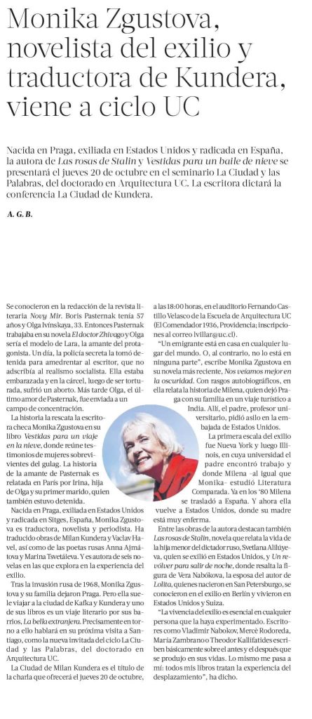 La Tercera destaca que Monika Zgustova, novelista y traductora de Milan Kundera, es la nueva invitada del ciclo La Ciudad y las Palabras, del Doctorado en Arquitectura UC. El jueves 20 de octubre ofrecerá la charla La Ciudad de Milan Kundera.