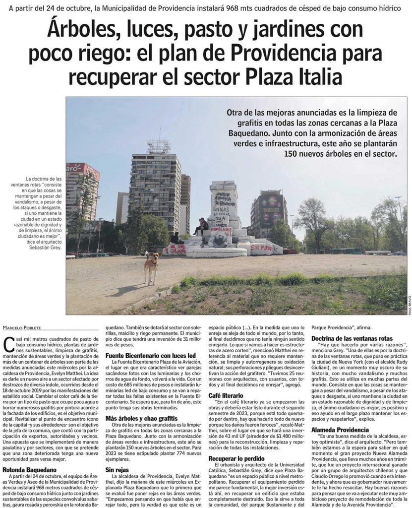 Las Últimas Noticias destaca el plan de la Municipalidad de Providencia para recuperar el sector Plaza Italia: árboles, luces, pasto y jardines con poco riego. Habla el académico Sebastián Gray.