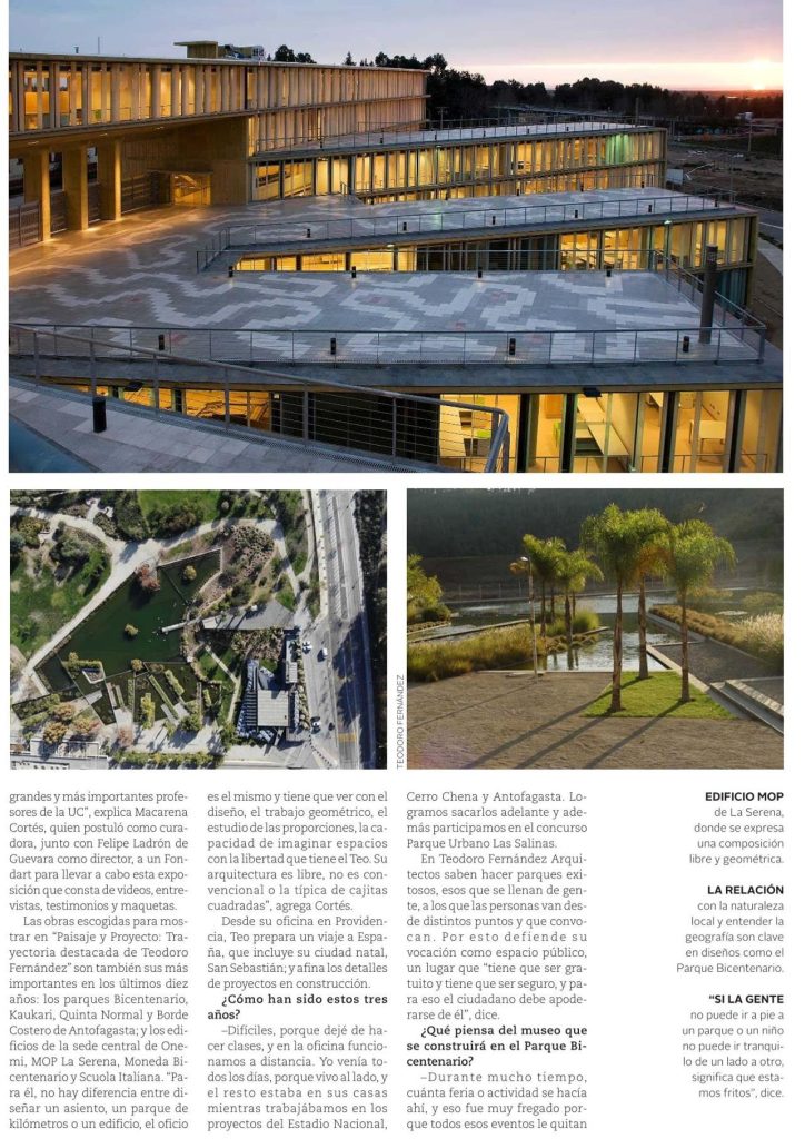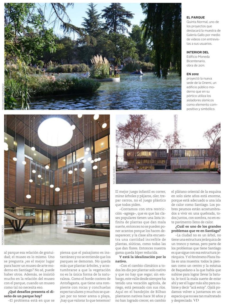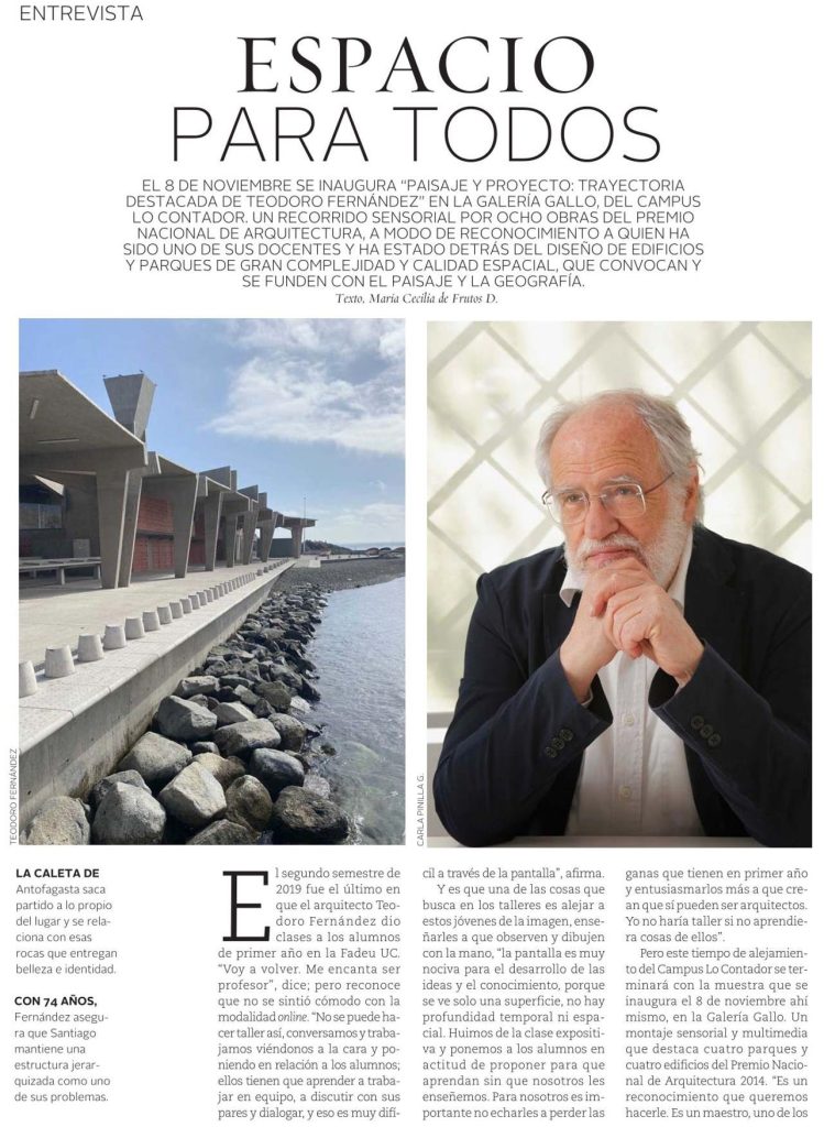 VD de El Mercurio destaca que el 8 de noviembre se inaugura “Paisaje y proyecto: trayectoria destacada de Teodoro Fernández” en la Galería Gallo, del Campus Lo Contador. El montaje destaca cuatro parques y cuatro edificios del profesor UC y Premio Nacional de Arquitectura 2014. Habla Macarena Cortés, curadora del proyecto.