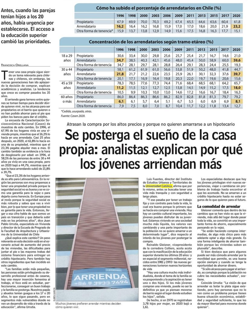 Las Últimas Noticias destaca que expertos explican por qué los jóvenes han ido aplazando la decisión de comprar una vivienda y arriendan más. Habla Luis Fuentes, director del Instituto de Estudios Urbanos.