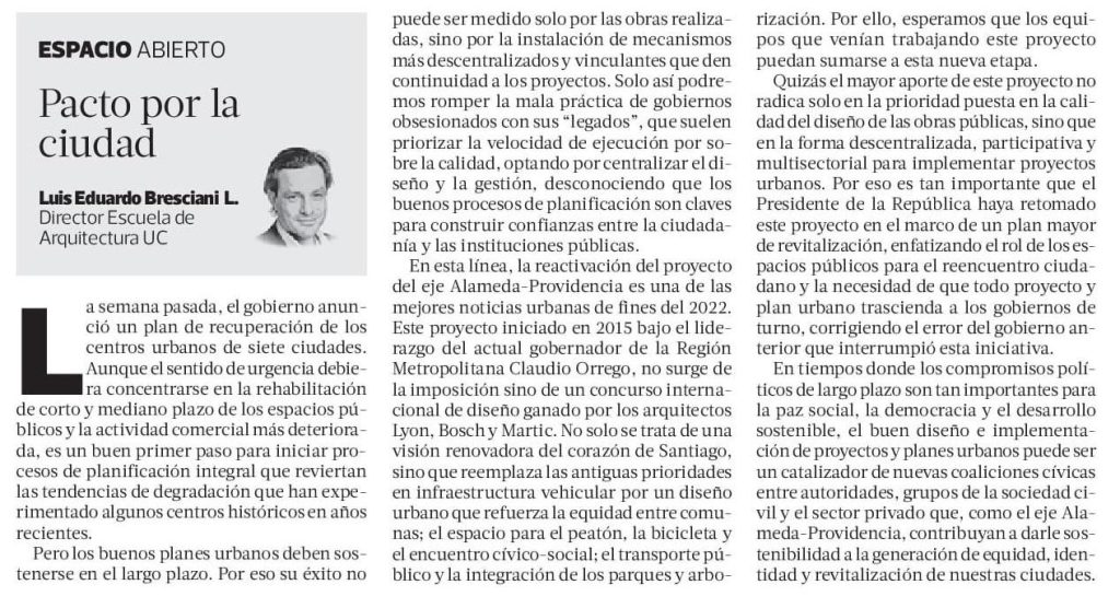 La Tercera publica columna de Luis Eduardo Bresciani, director de la escuela: “Pacto por la ciudad”.