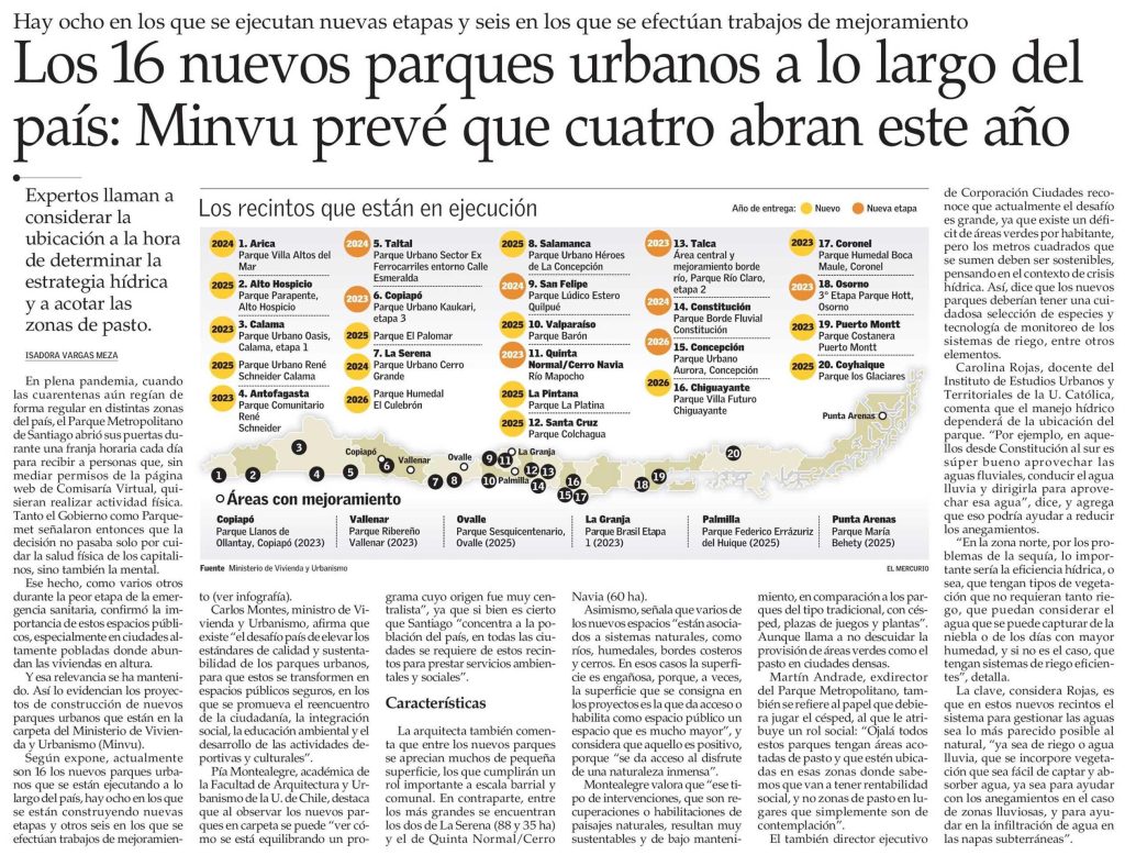 El Mercurio destaca que son 16 los nuevos parques urbanos que se están ejecutando a lo largo del país. El Ministerio de Vivienda y Urbanismo prevé que cuatro abran este año. Habla la profesora Carolina Rojas.