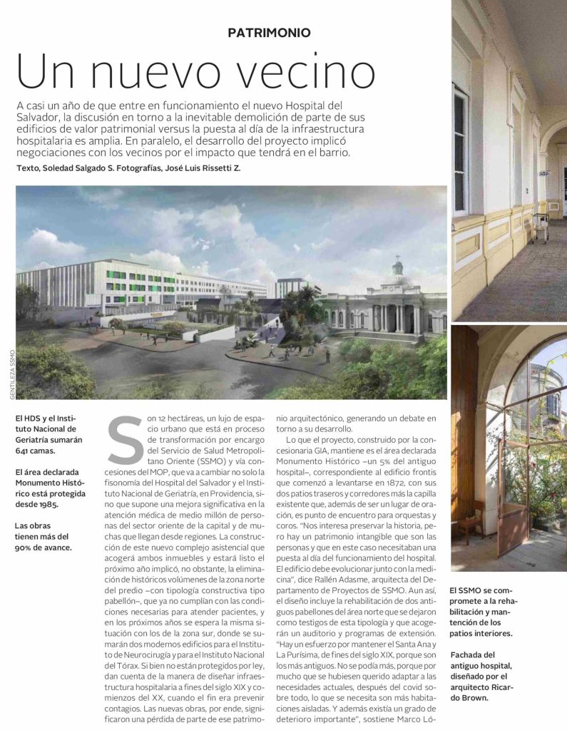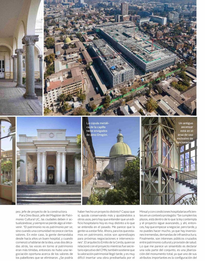 Revista VD de El Mercurio destaca que a casi un año de que entre en funcionamiento el nuevo Hospital del Salvador, la inevitable demolición de parte de sus edificios de valor patrimonial, para mejorar la infraestructura hospitalaria, genera un amplio debate. Habla Dino Bozzi, jefe del Magíster de Patrimonio Cultural UC.