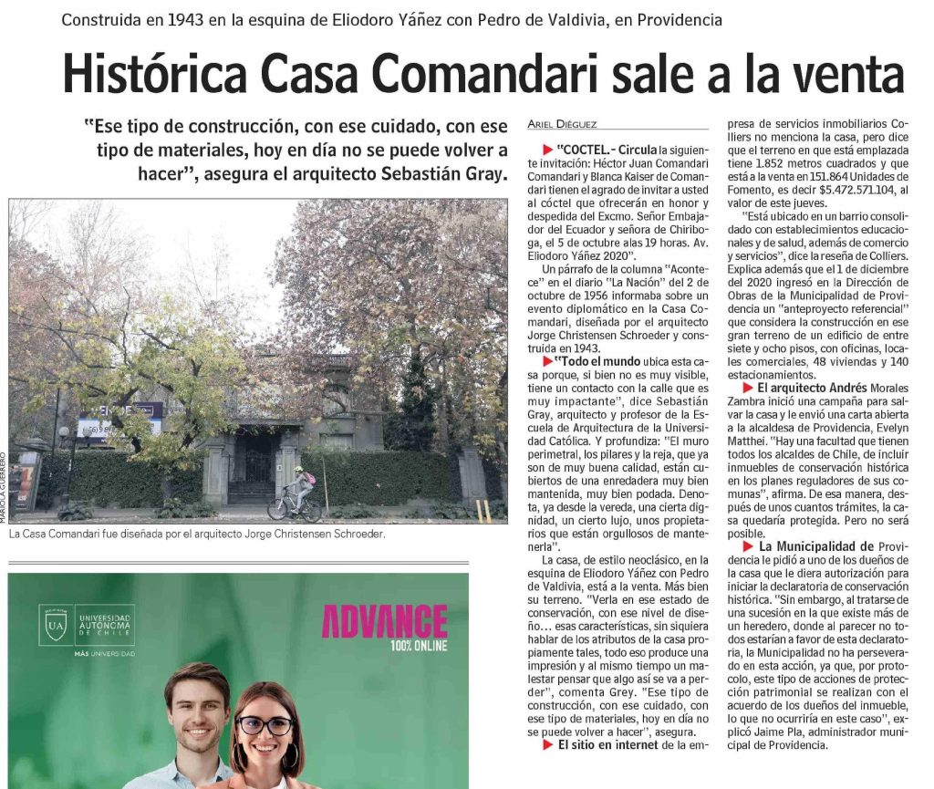 Las Últimas Noticias destaca que histórica Casa Comandari, en la esquina de Eliodoro Yáñez con Pedro de Valdivia, en Providencia, sale a la venta. Habla el profesor Sebastián Gray.