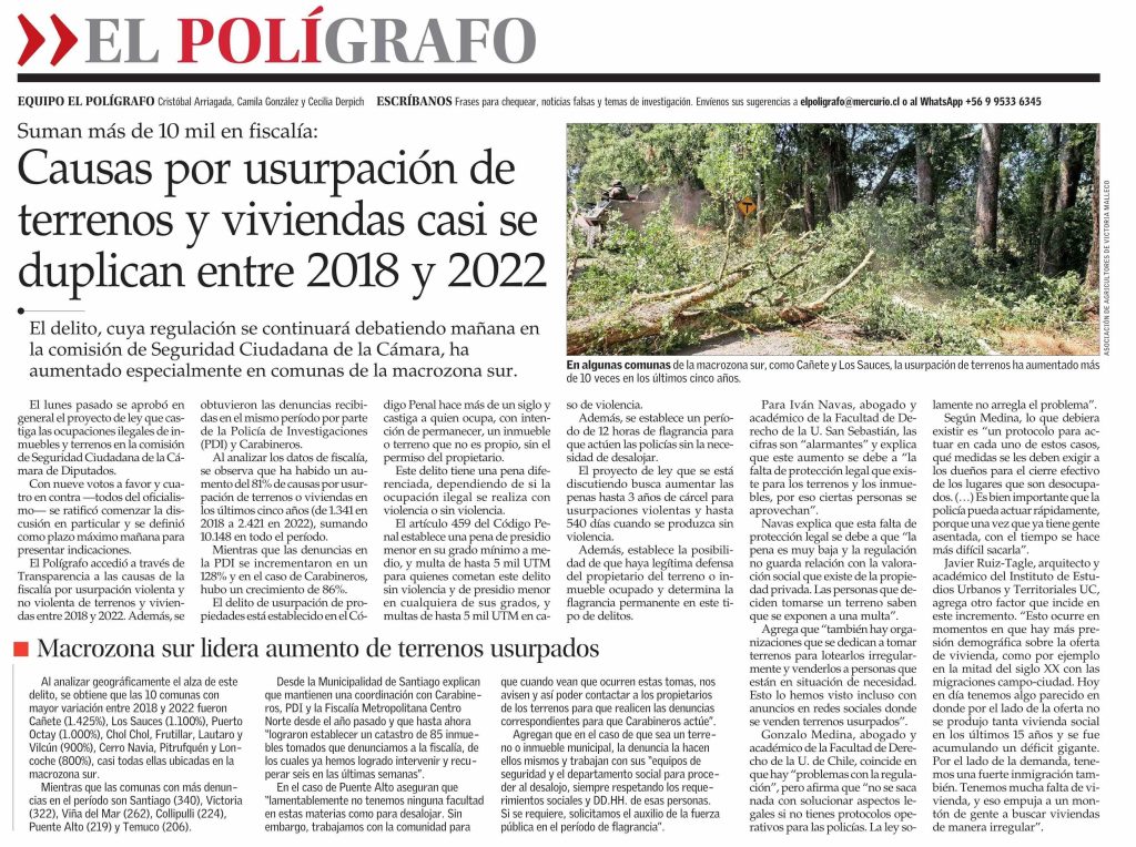 El Mercurio destaca que causas por usurpación de terrenos y viviendas casi se duplican entre 2018 y 2022. Macrozona sur lidera aumento de terrenos usurpados. Habla el académico Javier Ruiz-Tagle. + Revisa nota completa aquí.