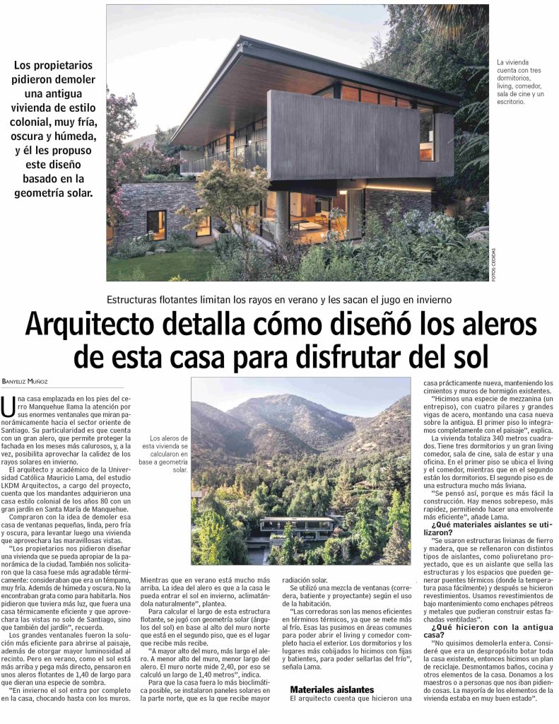 Las Últimas Noticias destaca que académico Mauricio Lama, del estudio LKDM Arquitectos, detalla diseño basado en la geometría solar de casa emplazada en los pies del cerro Manquehue. + Revisa nota completa aquí.