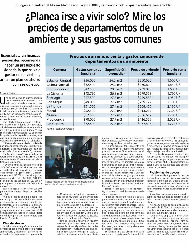 Las Últimas Noticias destaca que especialistas en finanzas personales recomiendan, para quienes planean irse a vivir solos, hacer un presupuesto de gastos y armar un plan de ahorro. Habla Luis Fuentes, director del IEUT.