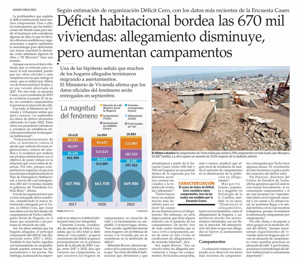 El Mercurio destaca que déficit habitacional bordea las 670 mil viviendas. Allegamiento disminuye, pero aumentan campamentos. Habla la profesora Margarita Greene. + Revisa nota completa aquí.