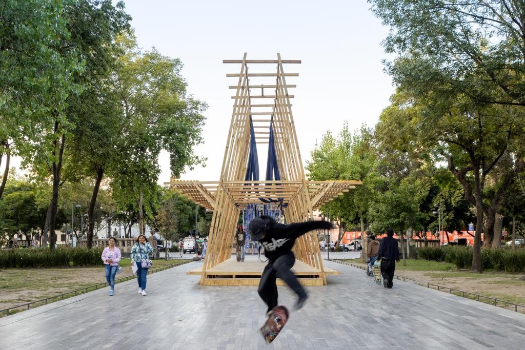 Por otro lado, las propuestas realizadas por los estudiantes permitieron programar —junto con clases teóricas y charlas— el pabellón que Hevia y Griborio diseñaron en representación de CENTRO para el Festival Mextrópoli 2023, construcción que se inscribe dentro de una investigación del profesor ARQ UC denominada “Sistemas estructurales”, en donde la repetición de una única sección, extremadamente detallada, configura el proyecto. En este caso, el pabellón se compuso a través de 2 puntales —inclinados en 10 grados— y 3 vigas. La primera se separa del suelo por 40 centímetros y conforma el piso del proyecto y dos bancas para activar el espacio; la segunda, de gran peralte y a 2,6 metros, genera dos aleros; y la tercera, amarra y remata el sistema a 7 metros de altura.