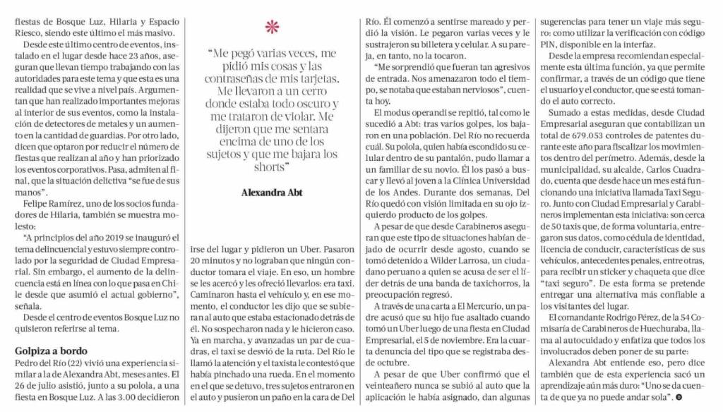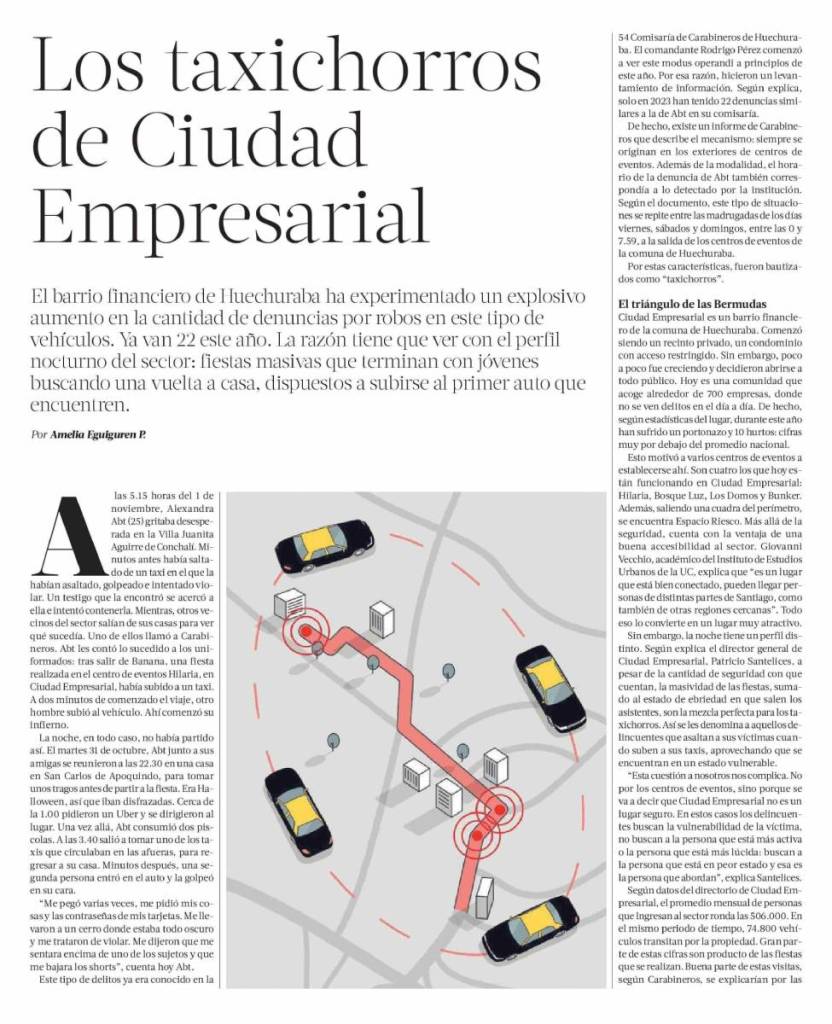 La Tercera destaca que Ciudad Empresarial , el barrio financiero de Huechuraba, ha experimentado un explosivo aumento en la cantidad de denuncias por robos por parte de taxistas. La razón tiene que ver con el perfil nocturno del sector: fiestas masivas que terminan con jóvenes buscando transporte. Habla el académico Giovanni Vecchio.