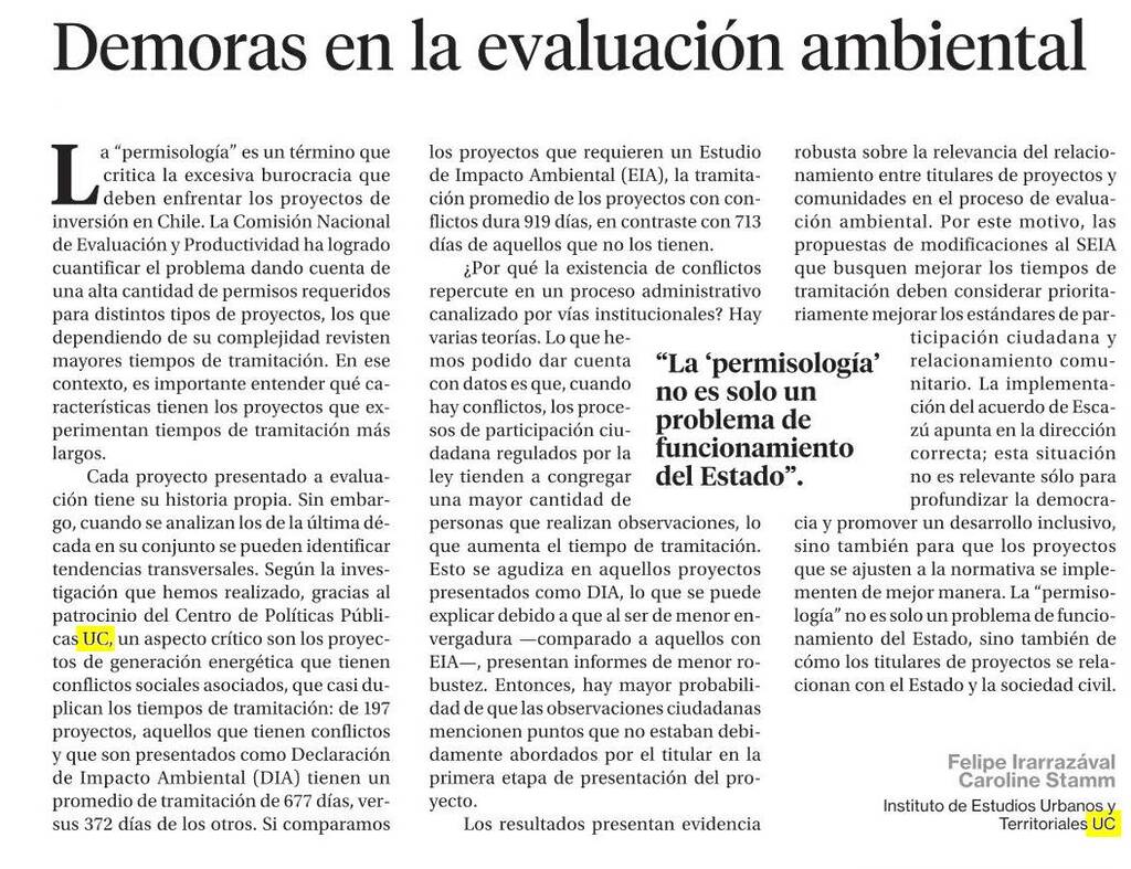 La Segunda publica columna de los académicos del Instituto de Estudios Urbanos, Felipe Irarrazával y Caroline Stamm: “Demoras en la evaluación ambiental”. + Revisa nota completa aquí.