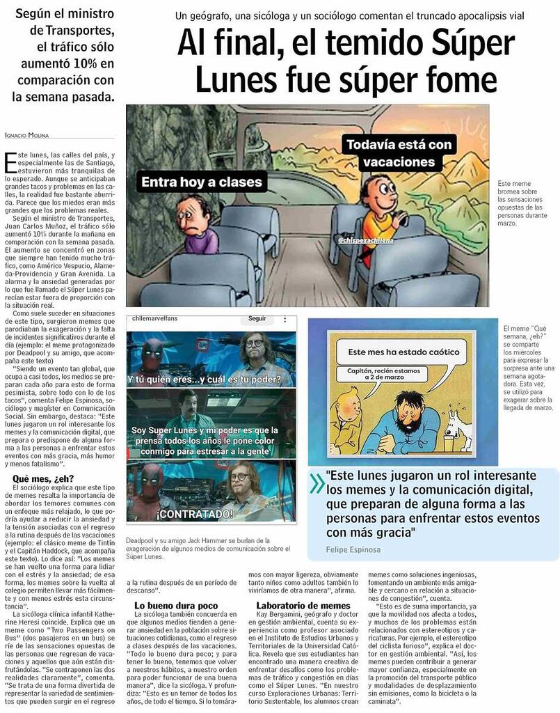 Las Últimas Noticias publica que según el ministro de Transportes, el tráfico de ayer lunes sólo aumentó 10% en comparación con la semana pasada. Un geógrafo, una sicóloga y un sociólogo comentan. Habla el profesor del Instituto de Estudios Urbanos, Kay Bergamini. + Revisa nota completa aquí