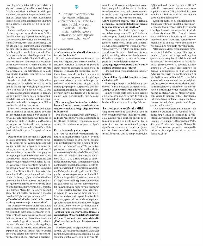 Medios destacan que el autor argentino Alan Pauls visita Chile en el marco del ciclo La Ciudad y las Palabras de la UC, donde dará la charla Berlín ciudad latente. + Revisa las notas completas aquí. El Mostrador La Tercera
