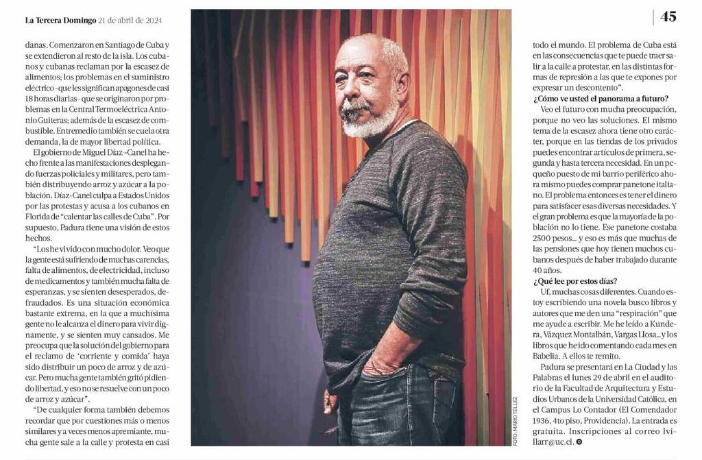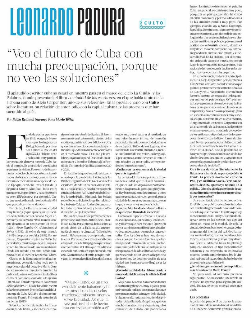 La Tercera entrevista al escritor cubano Leonardo Padura, invitado a Chile en el marco del ciclo La Ciudad y las Palabras UC, donde dará una conferencia y presentará el libro La ciudad de los escritores, publicado por Ediciones UC. El volumen reúne una serie de conferencias y entrevistas que dieron diferentes escritores en el marco del mismo programa. Beethovenfm.cl destaca la conferencia.