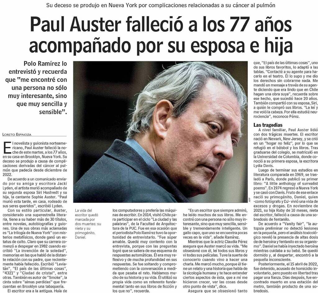 Medios publican que el novelista y guionista norteamericano Paul Auster falleció la noche de este martes, a los 77 años, en su casa en Brooklyn, Nueva York. Su deceso se produjo a causa de complicaciones derivadas del cáncer al pulmón que padecía desde diciembre de 2022. En 2014 visitó Chile para participar en el ciclo La ciudad y las palabras UC.
