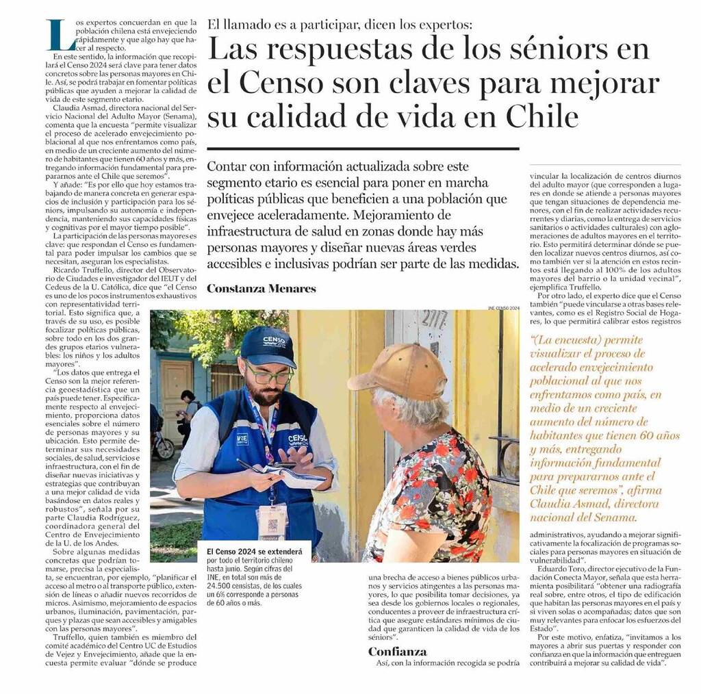 El Mercurio – Mundo Mayor destaca que las respuestas de los séniors en el Censo son claves para mejorar su calidad de vida en Chile. Habla Ricardo Truffello, director del Observatorio de Ciudades, investigador del IEUT y del Cedeus UC y miembro del comité académico del Centro de Estudios de Vejez y Envejecimiento UC.